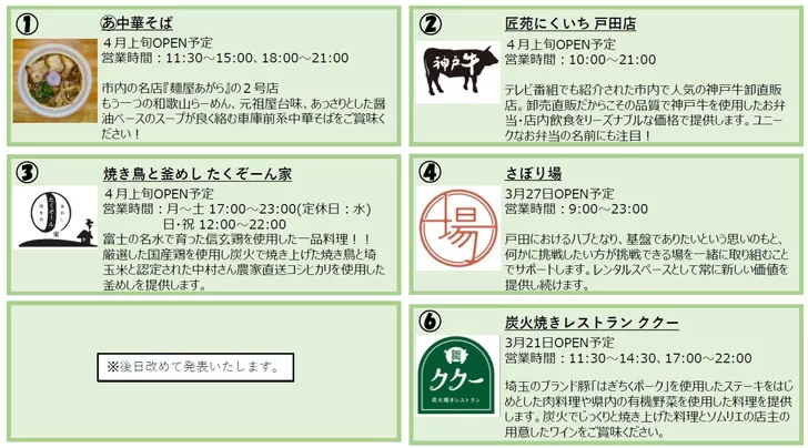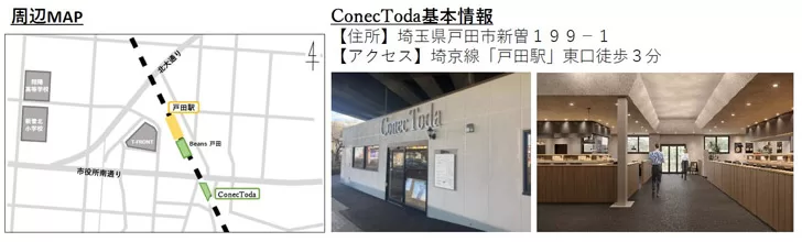 「地域の店舗と共に賑いを生み、地域の魅力を発信する場所」をコンセプトに、埼京線戸田駅付近高架下を10区画からなる空間としてオープンいたします。戸田をはじめとした県内の魅力をギュっと詰め込んだ隠れた名店や地元愛に溢れた方に活動場所を提供する方に出店いただきます。地域の魅力が集まる「ConecToda」にぜひご家族・ご友人をお誘いのうえお越しください。