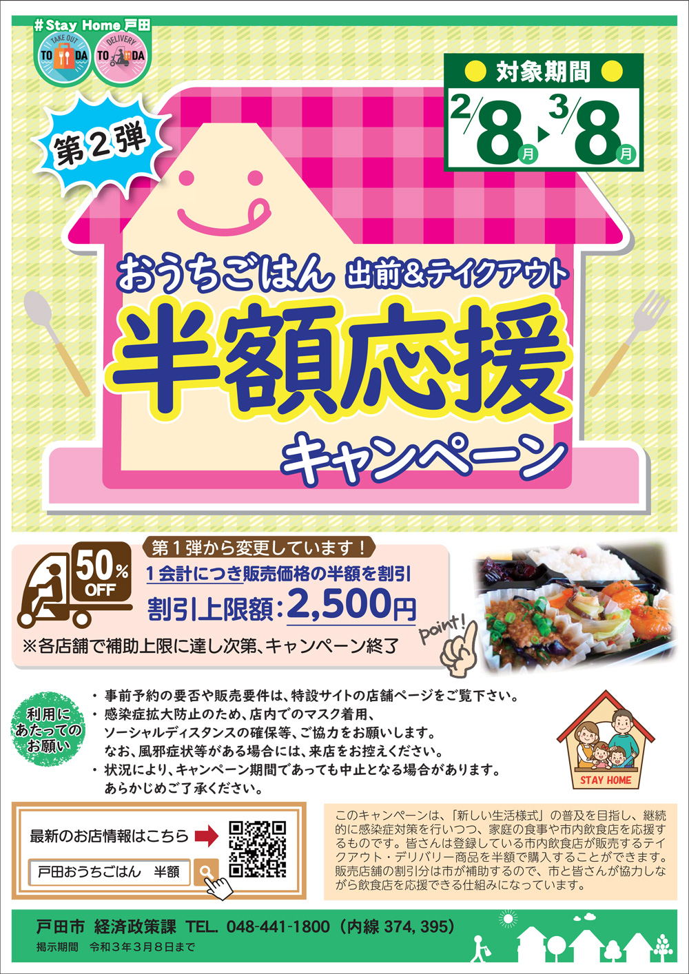 おうちごはん半額応援キャンペーンは終了しました。の対象店、定休日、対応時間、注意事項等詳細は戸田市の公式サイトをご確認ください。