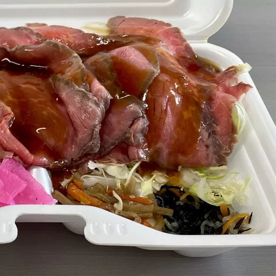 サンオフィングさんは、戸田市川岸3丁目、国道17号沿いのロイヤルホームセンターと戸田橋の間にあるお弁当屋さんです。大きなお肉が乗り、もち麦入りのご飯もボリュームたっぷり。生姜焼き、牛カルビ、ローストビーフ、ビーフカレーのほかに、1度に2つの美味しさを楽しむことができるハーフ&ハーフのメニューも。