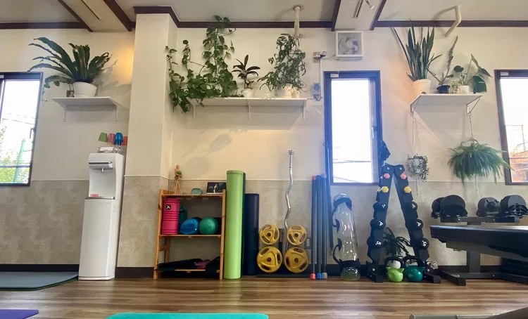 実際にスタジオを訪れてみると、まず感じるのは空間の心地よさ。ジムというと、少し無機質でストイックな雰囲気のお店も多いですが、E STUDIOさんは印象が違います。窓から入る自然光と、店内に置かれた植物。明るく落ち着いた空間で、トレーニングを続けやすい雰囲気が整えられていました。「心地よく通ってもらいたい」というオーナーの想いが感じられるスタジオです。