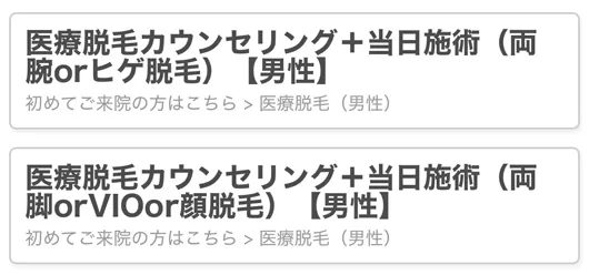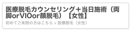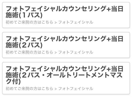 ハイドラジェントル施術の1週間以降を目安に、『顔脱毛』『ヒゲ脱毛』『フォトフェイシャル』を別でご予約ください。対象となるメニューはこちらです。