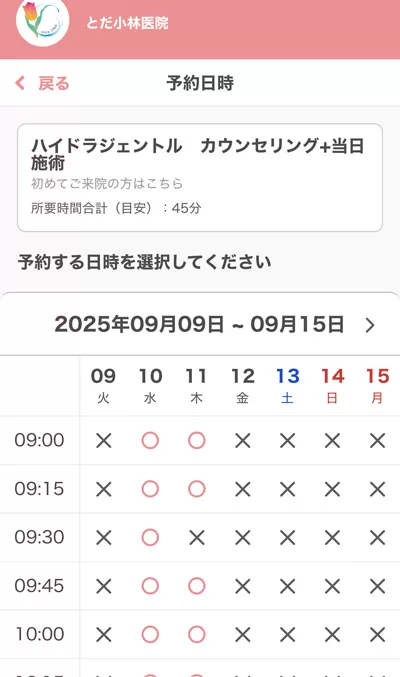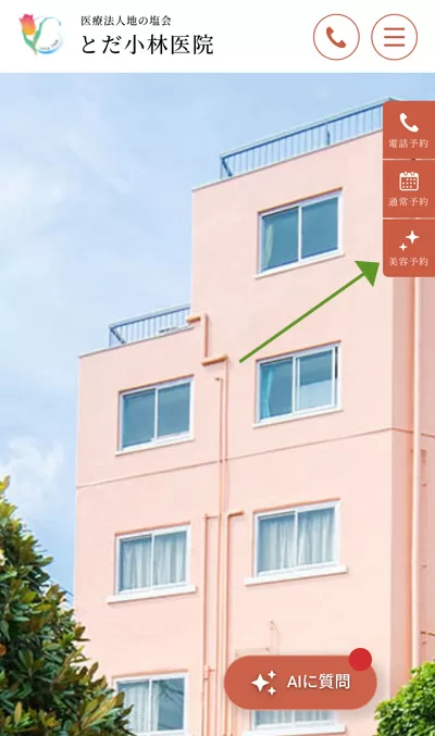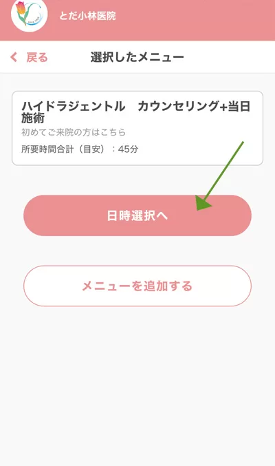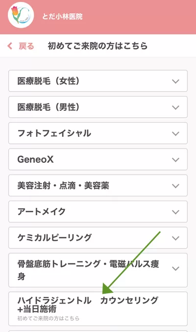 来院時には、とだ小林医院さん1階の受付にて、美容予約であることをお伝えください。初診の場合、診察券の作成、カウンセリング(無料)と施術同意書へのご署名がございます。