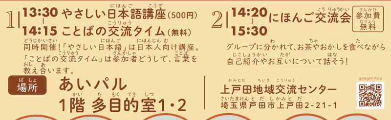 2月23日(月・祝)に上戸田地域交流センターあいパルで、「にほんご交流会」が開催されます。日本人も外国人も、みんなで楽しい時間を過ごしましょう。