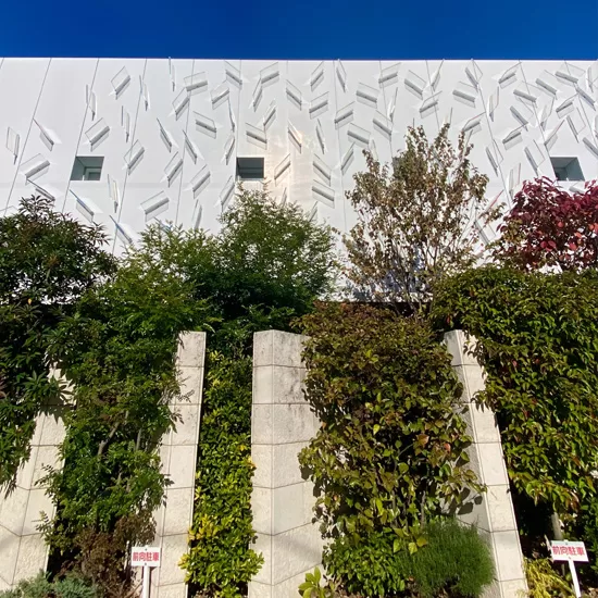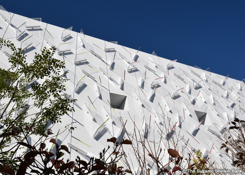 戸田公園駅から徒歩10分程の場所、五差路(交差点)の近くに一際目を見張る建物。巣鴨信用金庫戸田支店は、2018年11月に戸田市本町2丁目から現在の本町3丁目に移転。既存の銀行や信用金庫とは一線を画した外観、まるで美術館のような建て構えで、接する通りにも建物にも金融機関を彷彿させる看板は見当たらない。市内に暮していても毎回通るたびに見とれてしまうお洒落スポットです。(2020/8)