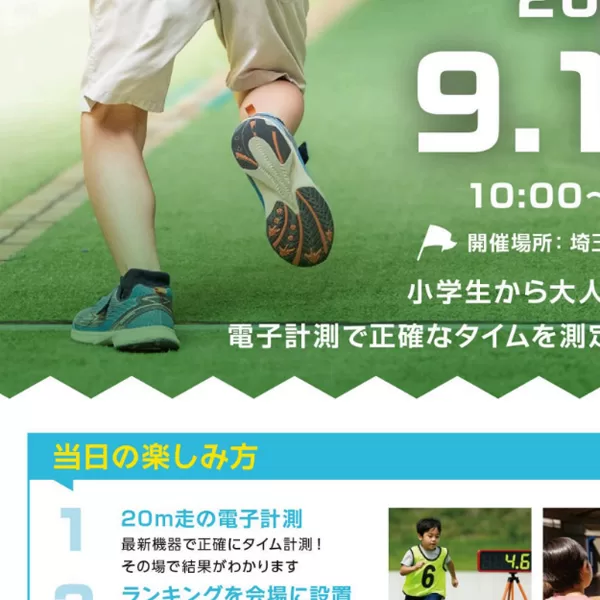 - かけっこ教室:小中学生対象、40分、講師 陸上系YouTuberケンちゃん