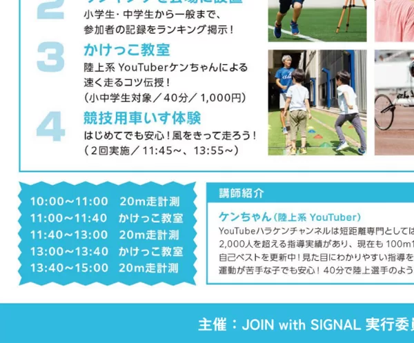かけっこイベント「JOIN with SIGNAL」が、9月13日に戸田駅前で開催されます!小中学生を対象とした「かけっこ教室」では、陸上系YouTuberのケンちゃんが講師として登場。20m走計測は誰でも参加OK!