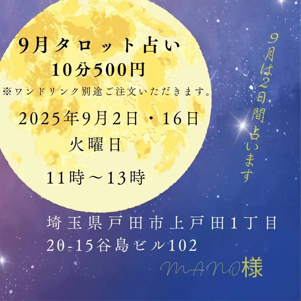 9月は2日間占います!タロット、数秘術、手相、霊視を使って総合的に鑑定させていただきます。