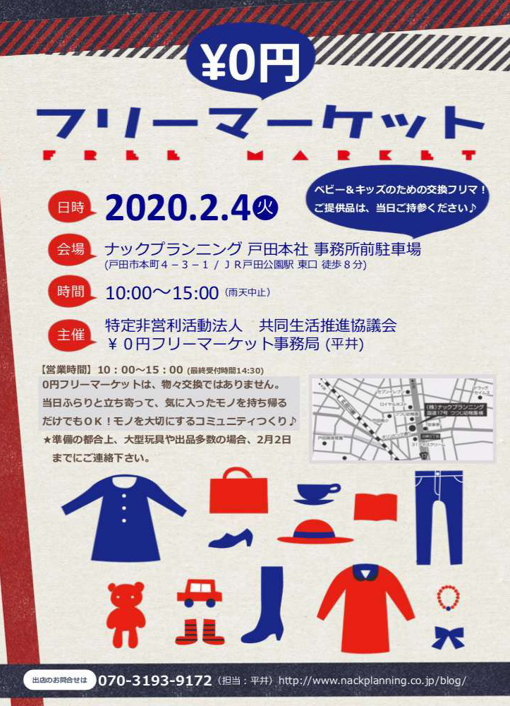 - ベビー&キッズのための交換フリマ!ご提供品は、当日ご持参ください♪(準備の都合上、大型玩具や出品多数の場合、2月2日までに ご連絡下さい)0円フリマは、物々交換ではありません。当日ふらりと立ち寄って、気に入ったモノを持ち帰るだけでもOK!