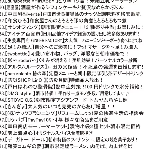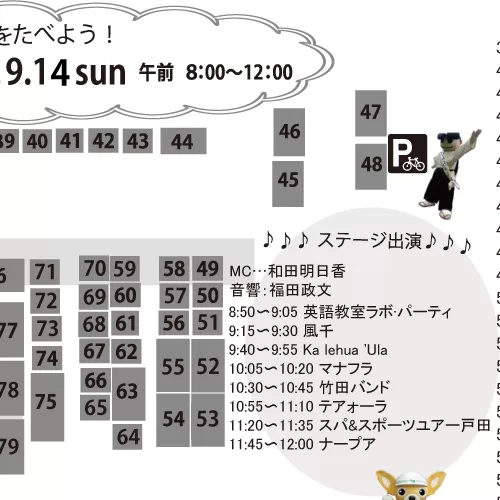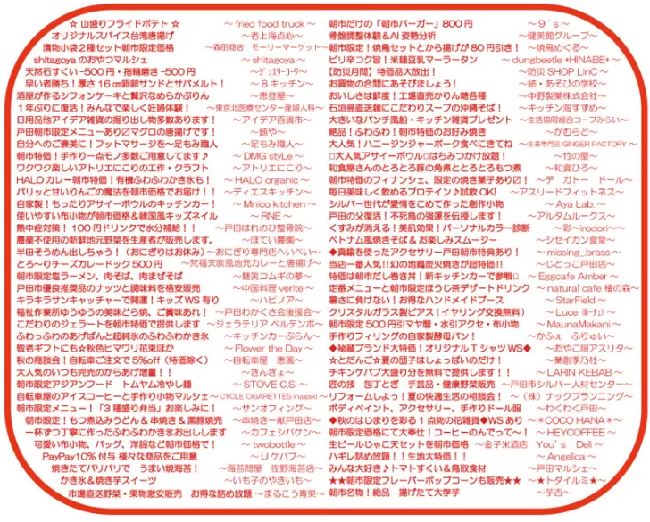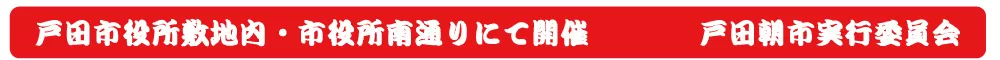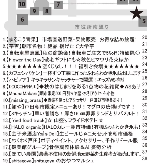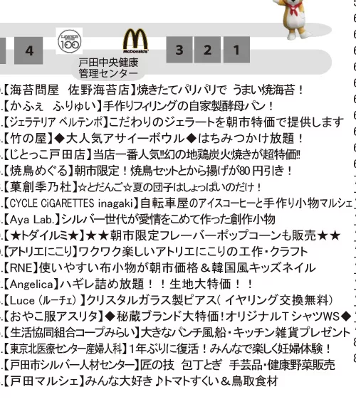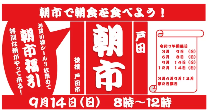 お出かけ2025年9月10日2025年9月14日戸田市イベント「戸田朝市」9月14日(日)開催! 目次1 「戸田朝市」9月14日(日)開催!2 開催情報2.1 日時2.2 会場2.3 主催2.4 後援2.5 チラシ2.5.1 おもて2.5.2 うら2.6 戸田朝市 公式サイト3 関連するページ3.1 戸田朝市3.2 周辺情報4 カテゴリと地域4.1 同じカテゴリ4.2 スポット周辺 「戸田朝市」9月14日(日)開催! 早起きして戸田市役所に集合!年4回開催の早起きイベント「戸田朝市」は、9月14日(日)に開催!地域密着イベントですが、市外から訪れてもたっぷり楽しむことが出来る規模感のイベントです。 開催情報 お買い物シール3枚を集めると、朝市福引に参加できるチャンス! 日時 2025/9/14(日)8:00~12:00 会場 戸田市役所敷地内と市役所南通り商店敷地内 戸田駅からの歩き方(Googleマップ) 戸田公園駅からの歩き方(Googleマップ) Googleマップ 主催 戸田朝市実行委員会 後援 戸田市 チラシ おもて うら 素材提供:戸田朝市実行委員会 戸田朝市 公式サイト 開催に関する最新情報は、公式インスタグラム・公式フェイスブックをご覧ください。 インスタグラム Facebook 関連するページ 戸田朝市 イベント戸田朝市(戸田市上戸田/イベント)2025年5月31日 スポット戸田市役所〔行政機関〕2025年11月21日 周辺情報 スポット戸田市文化会館〔文化施設〕2025年11月23日 まとめ【自販機マップ】戸田市役所&文化会館周辺2025年8月30日 スポット後谷公園2025年11月22日 カテゴリと地域 同じカテゴリ カテゴリお出かけ(イベント、公園、スポーツ) みんなでぺったん!教会でもちつき大会♪ ~戸田駅最寄り・戸田福音自由教会~2026年1月21日【ボートレース戸田】パルクール鬼ごっこボートレース戸田カップ2026開催!2026年1月18日この冬どこ行く?リニューアルしたイオンモール北戸田で年末年始を楽しもう♪2025年12月26日【ボートレース戸田】新春お笑い&音楽ライブ 1/3(土)、4(日)に開催!2026年1月4日 スポット周辺 町名戸田市上戸田(かみとだ) 「にほんご交流会」~やさしい日本語講座、やさしい韓国語講座&にほんご交流会~2026年1月16日「麺笑 コムギの夢」2026年1月31日で閉店2026年1月11日イタリアンリゾート ペルティカ 戸田公園店2025年12月28日【戸田市・求人】児童発達支援・放課後等デイサービス JOIN(パートとアルバイト募集)2026年1月3日