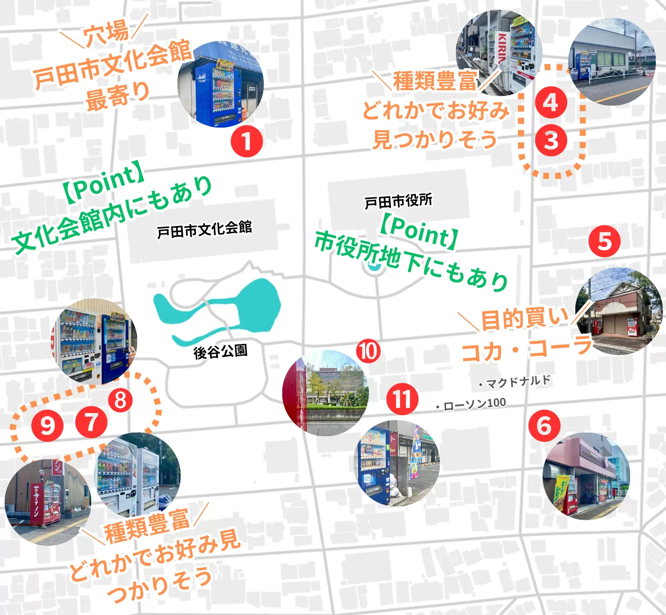 戸田市役所駐車場、戸田市文化会館、市役所通り、後谷公園