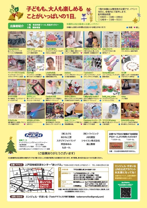 12月3日(土)に行われる『Todaママフェスタ』。1階の多目的室・あいパル広場では、ワークショップ、ハンドメイドアクセサリー、小物など雑貨の販売や模擬店、おいしいものもたくさん♪2階のキッチンスタジオでは「チャレンジカフェ」、3階のホールではこどもが楽しめるイベントがたくさん!絵本の読み聞かせイベント『音楽×絵本のコラボレーション 14ひきのあさごはん』も開催!10月に行われた出展説明会は応募者多数、3年振りとなる開催に期待!