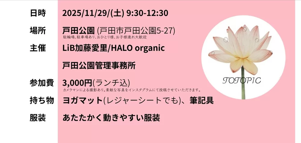 11月29日(土)に戸田公園で開催される「TOTONOU PICNIC vol.2」は、頑張る毎日に“ひと息つける朝”を届けるリトリートイベントです。ストレッチ、ウォーキング、ジャーナリング、そしてオーガニックランチまで。五感で“自分をととのえる”ひとときを過ごしてみませんか?