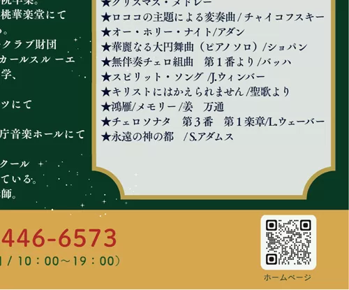 教会に飾られたクリスマスツリーのそばで、チェロのあたたかな音色に耳を傾ける、土曜午後のひととき。年末の慌ただしさから少し離れて、静かにクリスマスの空気を感じられる時間になりそうです。この時期ならではの雰囲気を味わいに、教会を訪れてみてください♪