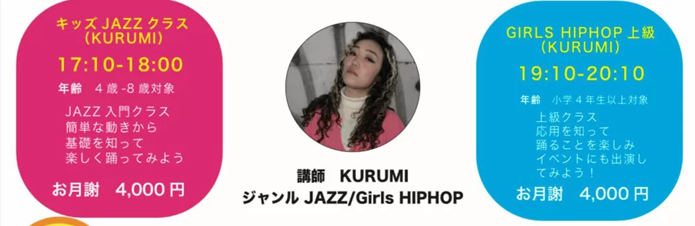 | GIRLS HIPHOP 上級 | 19:10-20:10 | 小学4年生以上 | KURUMI | ¥4,000 |