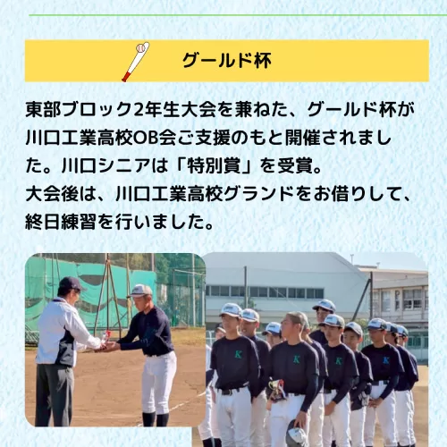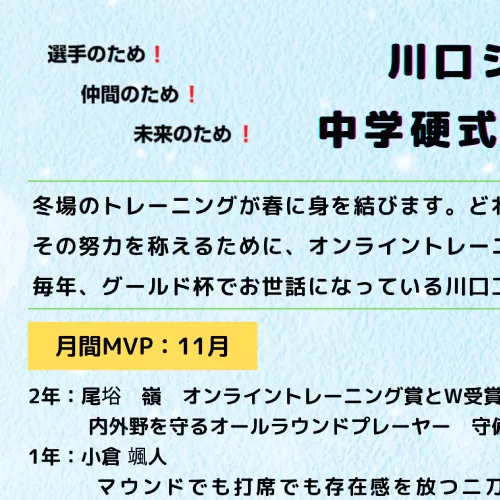 戸田公園の荒川河川敷で練習を行う学生の硬式野球チーム「川口リトルシニア」の広報誌到着!今回は「月間!川シニ vol.20」。11月の月間MVP、グールド杯、新設のオンライントレーニング賞、川ニシ飯の内容となります。