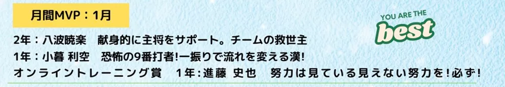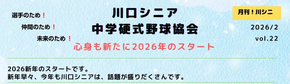 戸田公園の荒川河川敷で練習を行う学生の硬式野球チーム「川口リトルシニア」の広報誌到着!今回は「月間!川シニ vol.22」。1月の月間MVP、データ測定フィードバック講習会、川ニシ飯などをお届けします♪