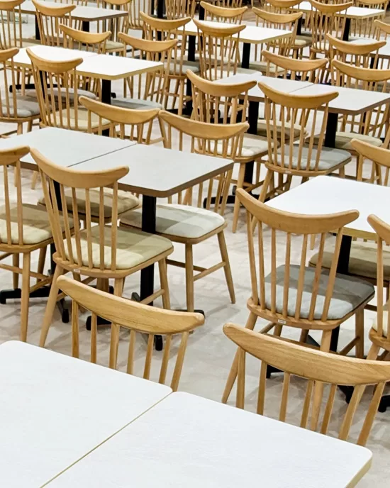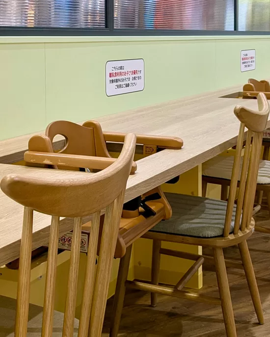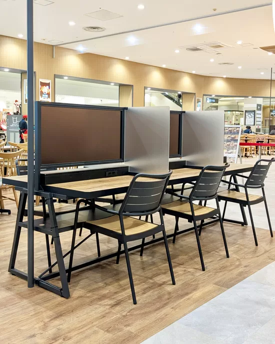 フードコートや飲食スペースも、テーブル配置や座席のレイアウトが整えられ、ひとりでも、家族でも、グループでも利用しやすい雰囲気。仕切りのあるおひとり様ブースには電源が配置され、子ども用の椅子が備えられたスペースもあり、小さなお子さん連れでも安心して食事ができます。