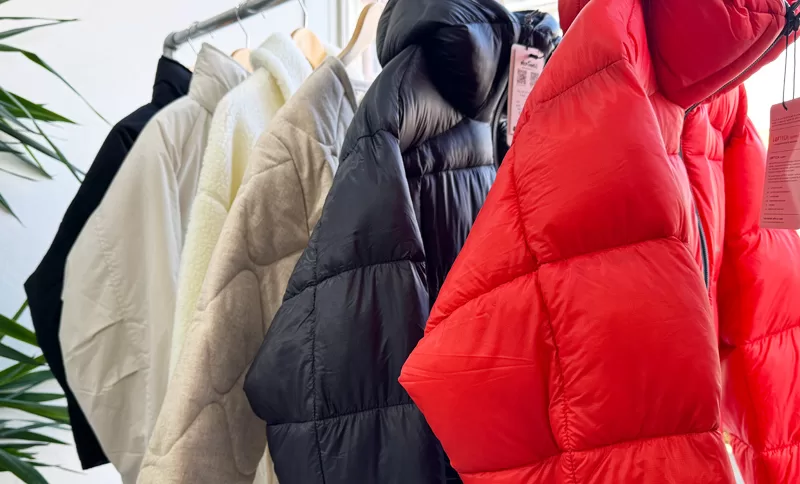 店内の雰囲気を少しだけご紹介。冬物アイテムを中心に、アウターやニット、トップス、小物類まで幅広く並んでいます。セール中ということもあり、サイズやカラーは在庫限りとのことです。